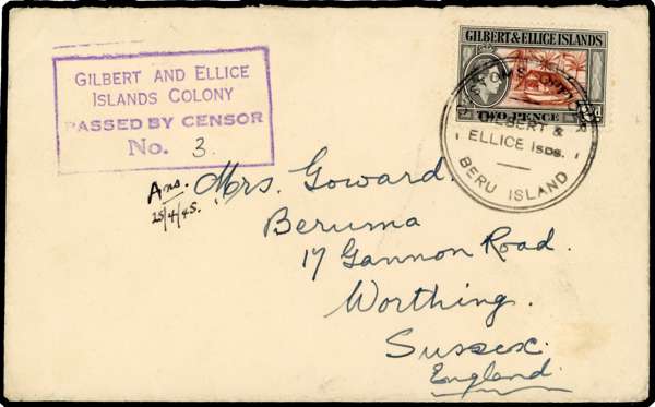 Postal History. 1945 envelope to UK bearing KG VI 2d, cancelled by CUSTOMS OFFICER/ BERU ISLAND undated handstamp. Boxed Censor 3 in violet alongside. Undated but with small note on front, ‘Ans. 25.4.45’