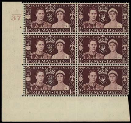 1937 1½d Coronation corner block of six, o.g., hinged on top left stamp only with a few trivial marks on the gum. Cylinder 4 no dot, showing Ray flaw corrected. One of the two pieces surviving from the three sheets printed (see footnote in the Specialised catalogue); the only block. Unpriced in the Specialised catalogue since it has not been on the market for many years; Brandon Certificate (1997). SG 461