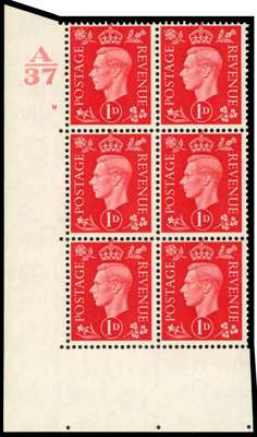 1937 1d scarlet Control A37 Cylinder 9 no stop block of six, o.g., hinged on the top pair only. Very scarce. SG 463 (Spec. £750)