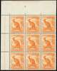 1942 ½d orange block of nine with part interpanneau margin at left, showing large part “3-” at upper left. Large part o.g. with only one stamp hinged, wrinkle affecting two stamps. Very rare. SG 179, ASC 180zb, $5000