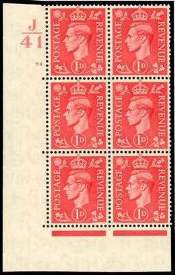 1941 1d pale scarlet Control J41 Cylinder 74 no stop block of six, unmounted o.g., showing the very scarce R20/1-2 curved frame variety. SG 486 (Spec. £250)