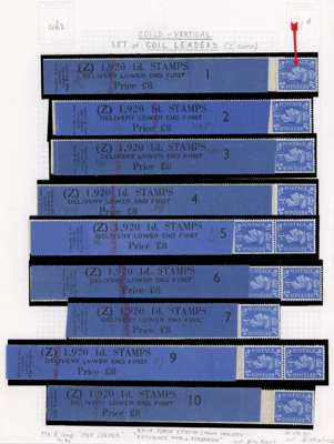 1951 1d light ultramarine set of nine coil leaders DELIVERY LOWER END FIRST, numbered 1-7, 9 and 10 (#8 said not to have been issued). Each with one or two stamps attached. SG 504