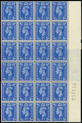1951 1d light ultramarine corner block of forty, sensibly folded for display, with Cyl 192 no dot R6/12 ‘keyhole’ variety, with R7/12 displaying a similar but less prominent variety. Hinged on the selvedge, with the stamps unmounted o.g., fine and fresh. SG 504, Q6d, £275