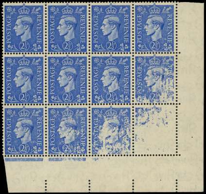 1941 2½d light ultramarine corner block of twelve o.g., hinged on the selvedge and two stamps in the top row only, showing a good dry print affecting most stamps, with the corner stamp mostly blank. Slightly discoloured gum and the right three stamps with a faint crease. SG 489 var