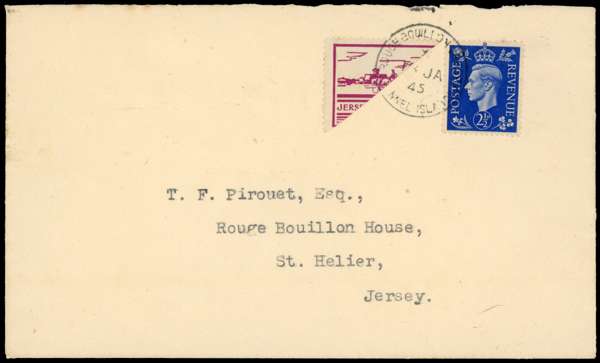 1945 envelope bearing 2½d ultramarine and Views 3d, the latter diagonally bisected, locally addressed, with Rouge Bouillon CDS of 13 JA. Rare. SG 8 var