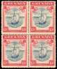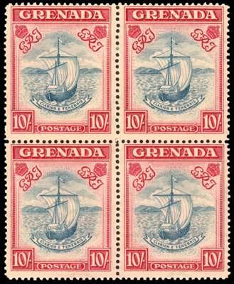 1940 10/- steel blue and bright carmine, perf 14 block of four, lightly hinged o.g. with evenly-browned gum, very fresh for this. SG 163a, £900
