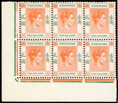 1938-40 $2 red-orange and green lower left corner block of six, fresh unmounted o.g. Lower left stamp with R10/1 LP deformed second 'L’ of DOLLARS (H&A 91), a nice variety. SG 157 var, £480
