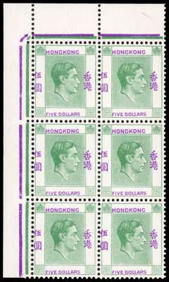 1948 $5 yellow-green and red-violet top left corner block of six (without Plate plug) unmounted o.g., probably from Requisition J. R2/1 LP flat base to ‘O’ of HONG. The duty plate is set low to left. SG 160ab, £780