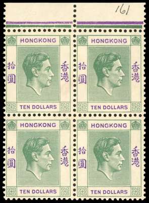 1938-40 $10 green and violet top marginal block of four, o.g., hinged on the selvedge only. Very good gum for this. SG 161, £3000