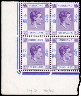 1946 $10 deep bright lilac and blue on ordinary paper lower left corner block of four, unmounted o.g. R9/6 LP flattened base to lowest element of KONG character. Scarce multiple. SG 162a, £1300