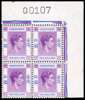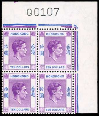 1951 $10 red-violet and ultramarine on chalky paper top right corner block of four with Requisition Q (the final printing), unmounted o.g. SG 162b, £800