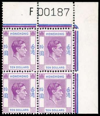 1947 $10 reddish violet and blue on chalky paper top right corner block of four with Requisition F, o.g., hinged on the selvedge only. Lower right stamp with a dark mark on the reverse, which may be natural gum contamination, otherwise fine. Ex Jack Gee. SG 162b, £800
