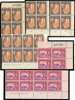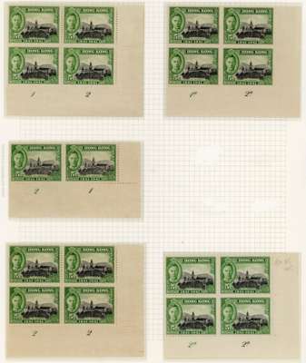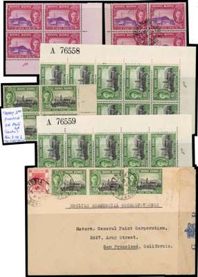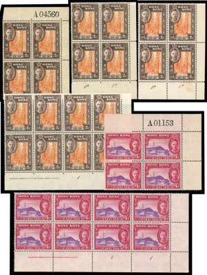 1941 Centenary set mint collection with Plate blocks of four and eight (different numbers) and Requisition A blocks. Also 5c Plate 2a R3/6 ‘short second pinnacle’ blocks (one toned) and used on censored cover. Occasional foxed spot but still a good group; also includes the signature of William E. Jones, the designer. SG 163-8