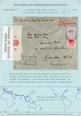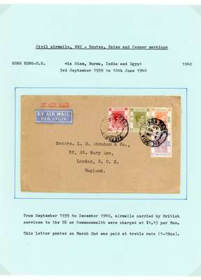 Postal History. 1940-1 airmail covers (9) to UK all commercial, with a variety of rates and frankings. $1.50 rate Via Rangoon; 40c (surface) triangular censor, small faults; $2 ($1 Centenary x 2) by sea to New York, uncensored; $3.45 (treble rate); $2 by sea to USA thence by air; $2.25 registered by sea to USA; $3 (should have been $2.80); $5 via Philippines by Clipper. Various censors, etc, ex Ian Warn