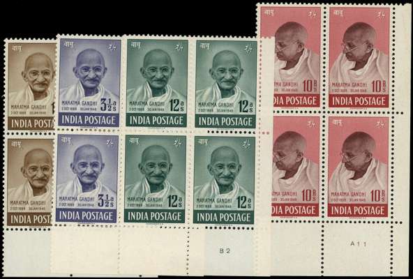 1948 Gandhi set in lower right Cylinder blocks of four, hinged on the selvedge only with the stamps unmounted o.g. SG 305-8, £1700