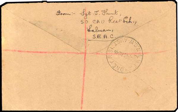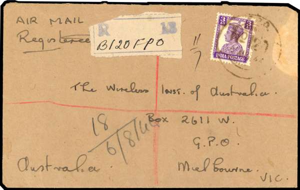 Postal History. 1946 commercial airmail registered cover bearing India 3a, tied by FPO No 120 CDS of 6 AUG 46 used at Labuan. Provisional Indian registration label with manuscript ‘B120FPO’, From an Australian sergeant in Labuan. Minor blemishes, but a rare cover