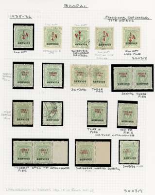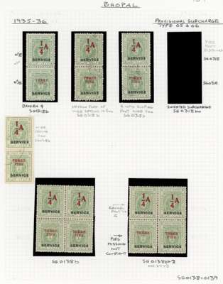 Officials. 1935-6 ¼a and 3p on ½a yellow-green. Se-tenant pairs mint (5, two blocks and a pair) and three pairs used; further ¼a, one mint, one used with inverted surcharge and the others minor variants; 3p including THEEE mint (2, one in a block) and used, THRFE mint block, inverted surcharge mint and used, also uncatalogued “THR E”, “THR EE” and “THREF”. Condition a little mixed but mainly fine. SG O318/9 and variants, £1500+