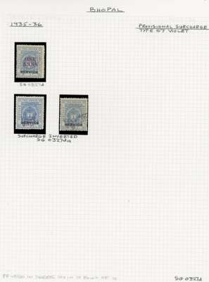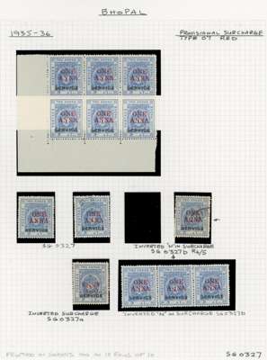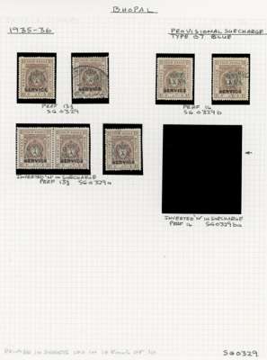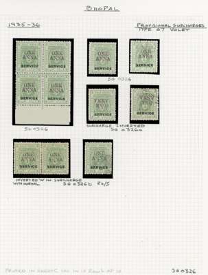 Officials. 1935-6 1a surcharges collection. Includes 1a on ½a surcharge inverted mint and used, inverted ‘N’ mint pair (poor) and used; 1a red surcharge on 2a inverted ‘N’ mint and used (latter slightly foxed), inverted surcharge used; violet surcharge mint, inverted surcharge mint and used; 1a on 4a perf 13½ inverted ‘N’ mint and used, and perf 14 pair mint and used. SG O326/9, £1500+