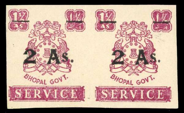 1949 2a on 1½a, bars though values at top, imperforate horizontal pair, fine unmounted o.g. SG O326b, £500