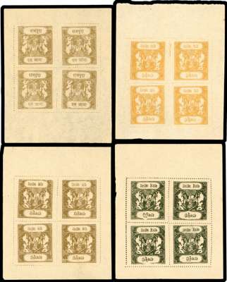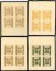 1918? 2½a buff, 10a bistre x 2 good shades and 12a blackish green unused sheets of four. The two 10a and the 12a each with one stamp showing ‘4th character turned to left’. Trivial edge nicks and bends. SG 50, 52, a, 53b, ba, £810