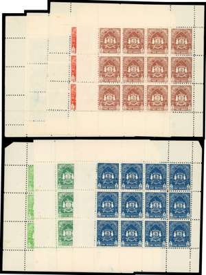 1941-4 set of seven in complete sheets of twelve, the 3p and 6p later printings without gum as issued, the others unmounted o.g. One 8a and one 1r with foxed spots, otherwise fine. SG 79-85