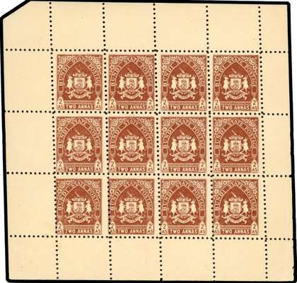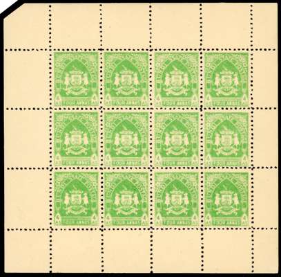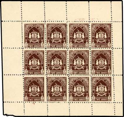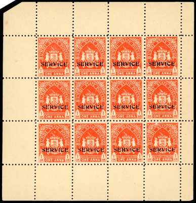 1941-4 sheets of twelve. 2a chestnut full o.g., one stamp with a foxed spot on reverse; 2a deep brown, without gum as issued; 4a bright green unmounted o.g., and Service 1a unmounted o.g. SG 82, a, 83, O55, £768