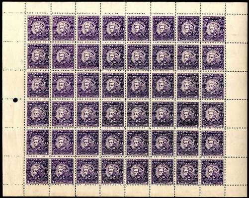 1948-50 3a4p sheet of 48, unused with dried gum. Includes R1/7 tail to turban, 6/1-2 Die II impressions, and R2/1 with a notable plate scratch. Very scarce in this format. SG 116, a, b, £4250