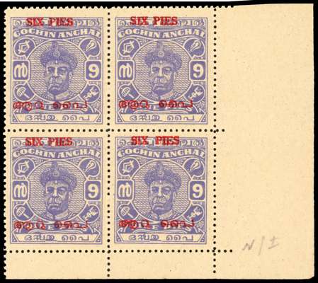 IFS Cochin 1949 unissued 6p on 9p red surcharge block unused