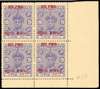 1949 6p red surcharge on 9p ultramarine (Type 29) corner block of four, unused without gum as are all these. The side selvedge shows reversed impressions of the surcharge. Prepared for use but not issued. See footnote after SG 126, £520
