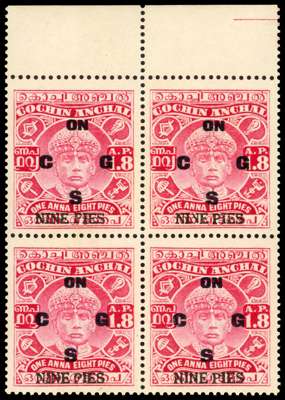 Officials. 1942-3 9p on 1a8p top marginal block of four, hinged on the selvedge with the stamps unmounted o.g. SG O59, £1000