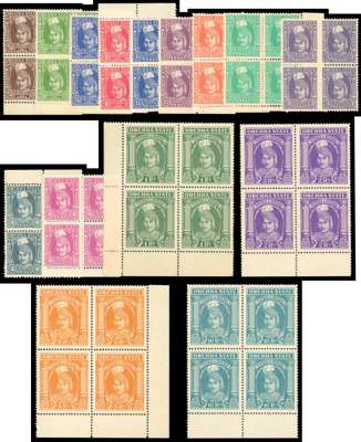 1939-42 set of fifteen to 10r in unmounted o.g. blocks of four (the 1r block with some gum disturbances), an extremely rare set of multiples. SG 31-45, £8650