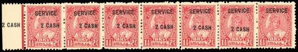Officials. 1943-5 2ca on 1½ch scarlet horizontal strip of seven, marginal at left, unused without gum as issued. The right stamp with ‘2 CASH’ omitted, showing an extra impression of the surcharge on the selvedge at left, very fine and desirable in this format. SG O106ab, £600