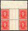 1942 2½d scarlet interpanneau block of four with the base of Plate 13 showing, folded up the gutter otherwise fine and rare. Not listed in ASC. SG 206, SC 230