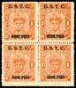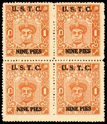 1950 9p on 1a with U.S.T.C. overprint block of four, unused without gum, as issued. SG 11b, £1300
