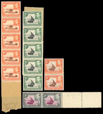 1938-52 mint coils. 5c black and green strip of twelve (with join); 10c red-brown and orange similar strip of eleven (with join), each fragile at one point; 50c perf 13 x 12½ pair. each of these with leader or end attached, the 50c in the form of blank perforated stamp-sized unwatermarked paper. Also the 5c reddish brown and orange in a coil-join pair, patchy gum. The leaders/ends are very unusual. SG 132/144e