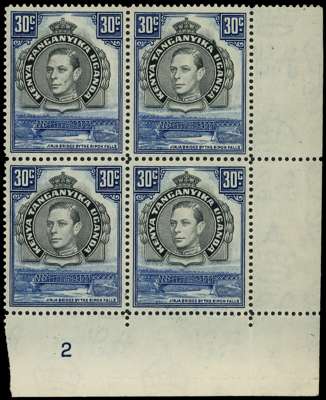 1941 30c black and dull violet-blue perf 14 lower right corner block of four with Vignette Plate 2, unmounted o.g. Very fresh, a rare block, Brandon Certificate (1999). SG 141a, £640
