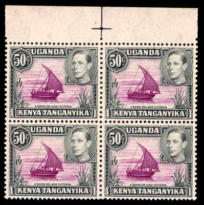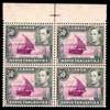 1938 50c purple and black, perf 13 x 11¾. Positional block of four, R2/5 rope not joined to sail; unmounted o.g., streaky and brownish as always, very fresh and fine for this. SG 144, a, £425