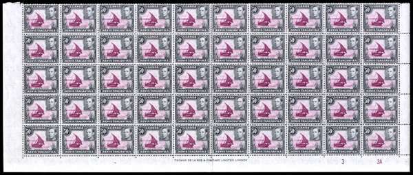 1950 50c perf 13 x 12½, dot removed, lower half-sheet of fifty from Plate 3-3A, unmounted o.g. with central vertical fold. Dots remaining on R6/1, 7/2, 7/4 and 9/1, giving four dot/no dot pairs. A spectacular piece. SG 144ea, eb, £3670