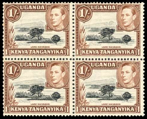 1942-9 1/- perf 13 x 11¾ block of four, upper right stamp with R6/7 Mountain retouch. Fine unmounted o.g. SG 145a, ac, £1520