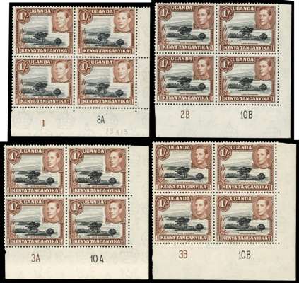 1950 1/- black and brown perf 13 x 12½, with clearer vignette impression. Four different o.g. Plate blocks: 1-8a, top pair hinged and slightly stained; 2B-10B, unmounted; 3A-10A, unmounted, and 3B-10B with light central hingemark. SG 145ba, £768