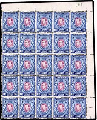 1949 reissue of the 10/- perf 14 in a top right quarter-sheet of twenty-five, with sheet number, unmounted o.g. Fine and fresh. SG 149a, £1500