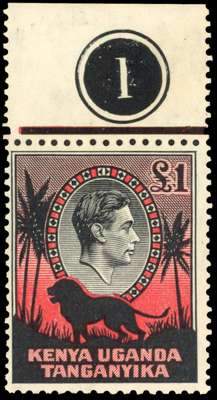 1938 £1 black and red perf 11¾ x 13 top marginal example with Plate plug, large part o.g. SG 150, £550