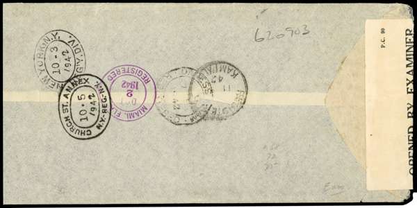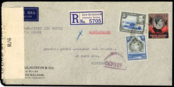 1942 registered airmail envelope to New York marked TRANSATLANTIC AIR ROUTE VIA MIAMI, bearing £1 perf 11¾ x 13, 3/- and 30c tied by Dar Es Salaam CDS of 7 SP 42. Semi-circular mauve CENSOR on front, censor tape at left and various transit/arrival backstamps. The first perforation £1 must be rare on a commercial cover. SG 150