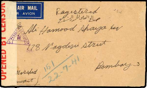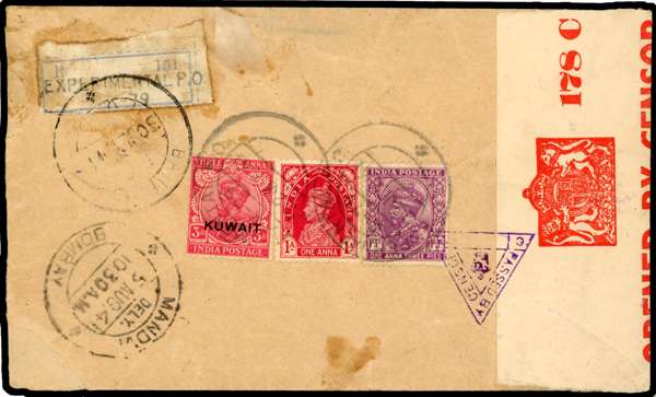 Postal History. 1941 registered envelope to Bombay with India KG V 1a3p, KG VI 1a and Kuwait KGV 3a, 22 JLY CDSs. Registered label Type 17 (some glue stains), red Censor label and violet triangular C23 (latter front and back). Ex Donaldson