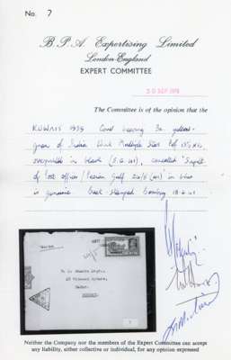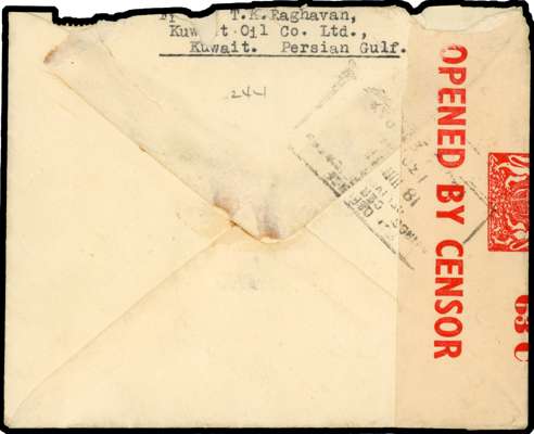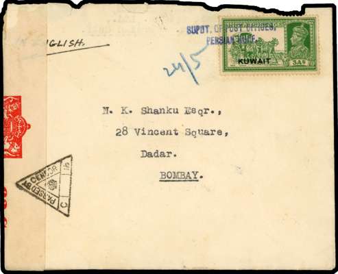 Postal History. 1941 envelope to Bombay with 3a yellow-green tied by blue Type 9 cancel, SUPDT. OF POST OFFICES,/ PERSIAN GULF with manuscript date 24/5 in blue alongside, Censor label and triangular Censor marking C16. Roughly opened and with a few slight stains, ex Donaldson, BPA Certificate (1985). SG 41