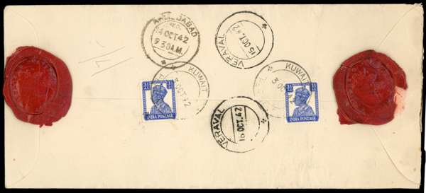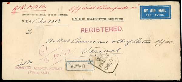 1942 registered Airmail OHMS envelope to Veraval, bearing on reverse two India 3½a tied by 3 OC CDSs. Ahmedabad transit and Veraval arrivals on reverse together with red wax seals of POLITICAL AGENCY/ KUWAIT (one fine). The front with tombstone Censor, POLITICAL AGANCY, KUWAIT handstamp (POLITICAL crossed through) and various manuscript markings. SG Z66