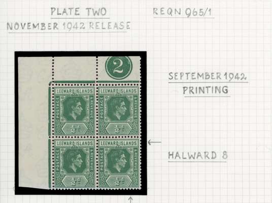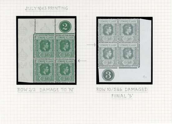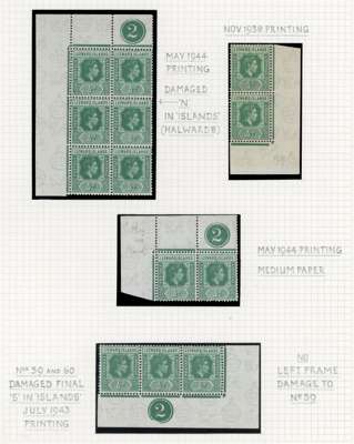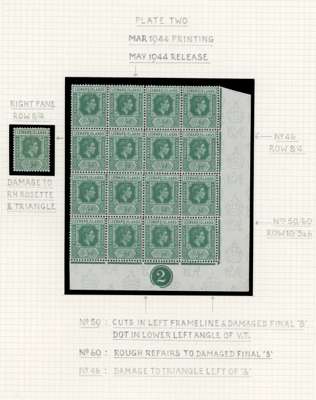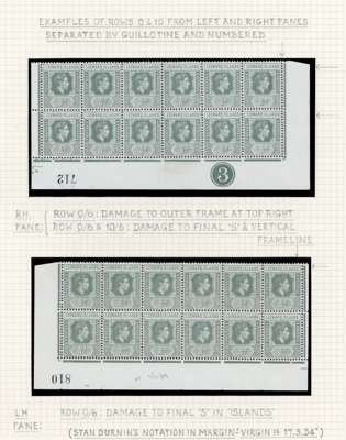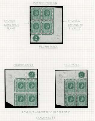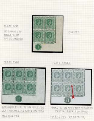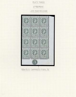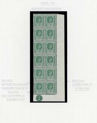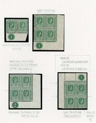 1938-50 ½d mint study written up on leaves, a fine group assigned to printings, with no fewer than seventeen Plate blocks including Plate 1 top left and bottom right, and two 1942 blocks with the ‘serrated edge’ flaw (these unmounted). Also numerous other varieties, including 1944 blocks showing the repair to the serrated edge. A really nice group, ex Harold Green. SG 96, b, 97