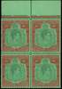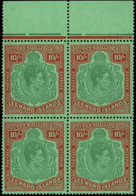 1943 (Dec.) 10/- green and red on green paper top marginal block of four, #3-16, HPFs #4 and 15a. Unmounted o.g. SG 113c, £600
