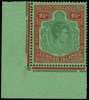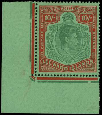 1944 (June) 10/- deep green and deep vermilion on green paper lower left corner example, unmounted o.g., HPFs #49a sliced scroll and 49b missing pearl. BPA Certificate (2014). SG 114ca, £1700