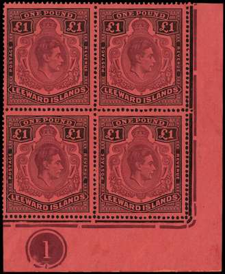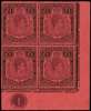 1942 (Feb.) £1 deep purple and black on carmine-red paper Plate block of four, HPFs #59ii repair to top right scroll and 60 broken lower right scroll, lightly hinged o.g. SG 114a, ae, £2000